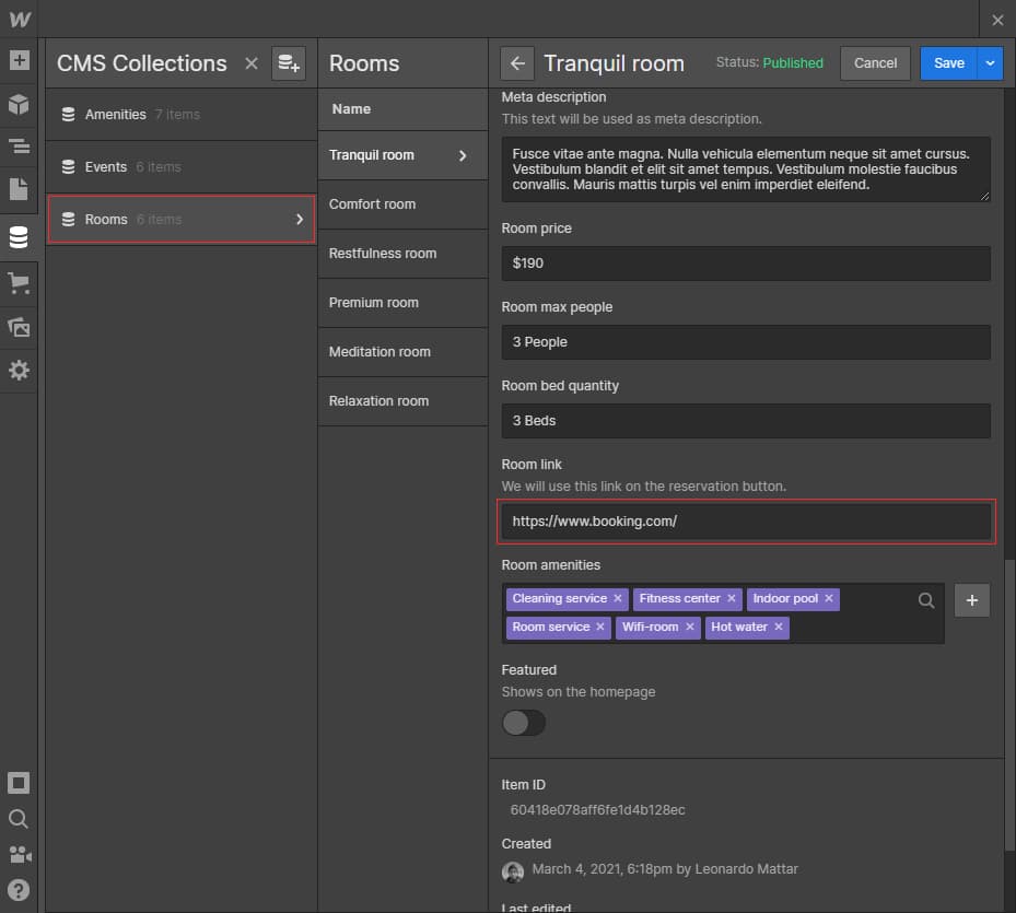 This template does not include a booking functionality. Please add your booking links in the rooms collection list using the field ‘Room link’.